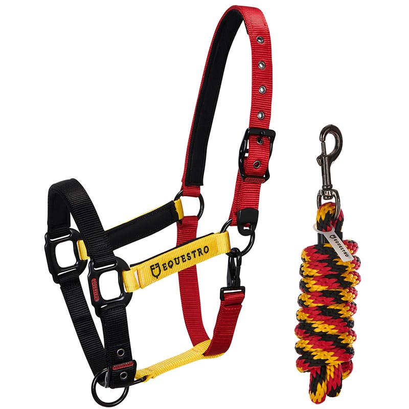 Cavezza completa Equestro, in nylon tricolore, con lunghina e fibbie laccate. Modello con soffici imbottiture in Neoprene rivestito in Lycra, molto morbido e antisfregamento.