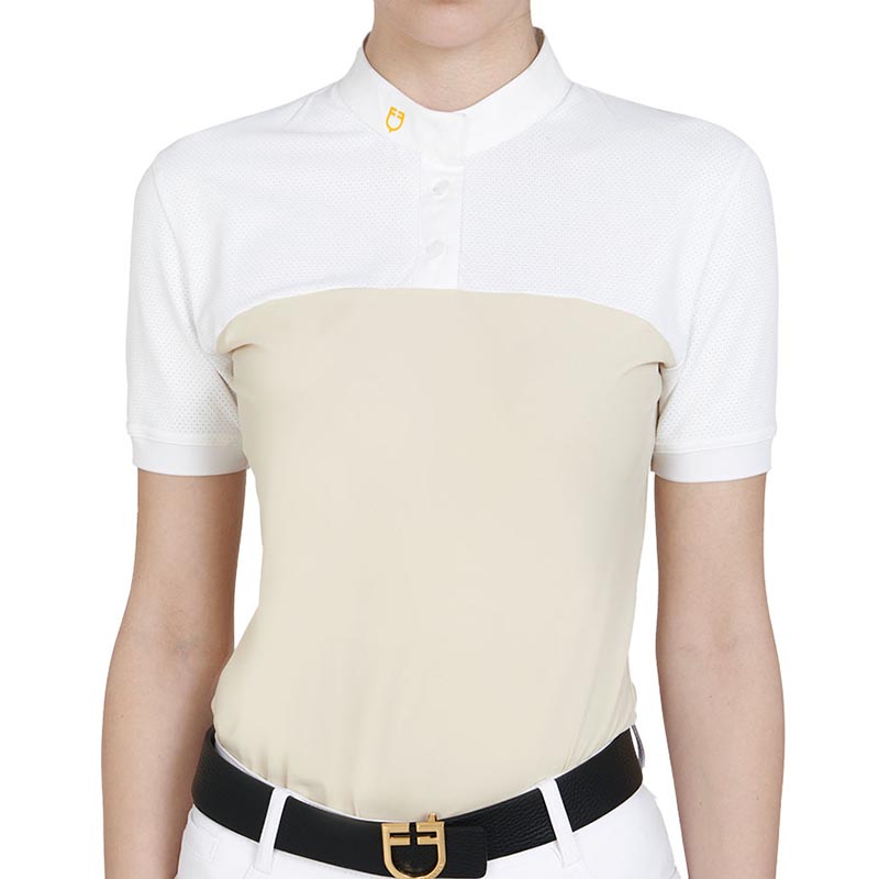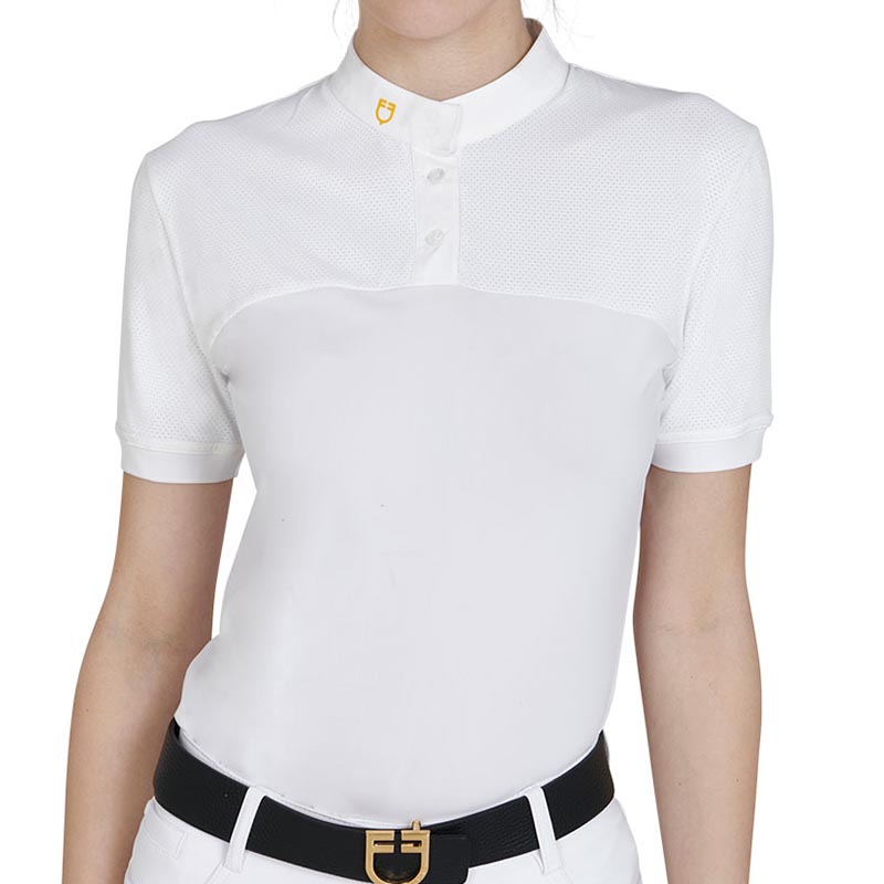 Polo da concorso donna manica corta Equestro Mesh. Polo da gara con colletto coreano, con parte superiore traforata effetto mesh. Chiusura con due bottoni bianchi e doppio bottoncino nascosto. Maniche corte traforate, logo stampato sul colletto e dietro la nuca. Tessuto tecnico elasticizzato e traspirante, vestibilità regolare con fianco sagomato ma non aderente.