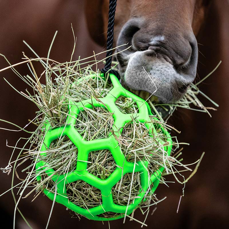 Palla contenitore per fieno Waldhausen con buchi, da appendere in box o per il paddock. Fornita con corda 2 metri. La palla per fieno di Waldhausen è un modo interattivo e stimolante per razionare il fieno, promuovere un’alimentazione più lenta e alleviare la noia del cavallo. La forma con fori di diverse dimensioni stimola il cavallo a tirare fuori il mangime, e permette di riempire con grande facilità la palla con fieno, carote, snack o pezzi di frutta nascosti. La palla è realizzata in gomma termoplastica, che non crea problemi alla bocca del cavallo. Grazie alla corda di 2 metri, può essere appesa all’interno del box come dispositivo slow-feeding e come gioco contro la noia, oppure utilizzata a paddock senza corda (sotto controllata supervisione). • Palla contenitore per fieno da box o paddock • Dispositivo slow-feeding, fa mangiare il cavallo più lentamente per una migliore digestione • Aiuta a combattere la noia da box e stimolare l’intelligenza del cavallo • In gomma termoplastica adatta al contatto con la bocca