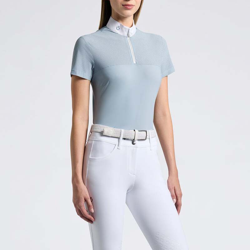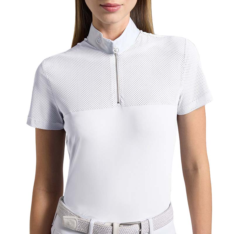 Polo da competizione da donna a maniche corte Nuova Collezione Cavalleria Toscana, realizzata in tessuto tecnico leggero con inserti in jersey traforato, per massima traspirabilità e comfort durante le gare. Questa camicia da concorso è un capo Made in Italy, realizzato con tessuti di qualità e dettagli pregiati. L’inserto in tessuto jersey traforato sulla parte superiore favorisce la regolazione della temperatura corporea e assicura il massimo comfort anche durante competizioni di alto livello. Il tessuto tecnico leggero e aderente offre una vestibilità impeccabile. Il colletto bianco in cotone è impreziosito dal logo CT ricamato. • Polo tecnica da equitazione a maniche corte per Monta Inglese • Tessuto tecnico leggero con inserti in jersey traforato, altamente traspirante e ad asciugatura rapida • Colletto bianco in popeline con chiusura zip invisibile • Logo Cavalleria Toscana sul colletto e sulla parte posteriore Articolo escluso dal Reso: questo articolo in saldo o in promozione non può essere cambiato, sostituito o rimborsato.